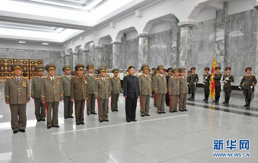 这张朝中社9月10日提供的照片显示,朝鲜最高领导人金正恩(中前)于9月9日0时,率朝鲜劳动党中央军事委员会、朝鲜国防委员会、朝鲜人民军最高司令部作战指挥成员前来锦绣山太阳宫,向金日成大元帅和金正日大元帅致敬。新华社/朝中社