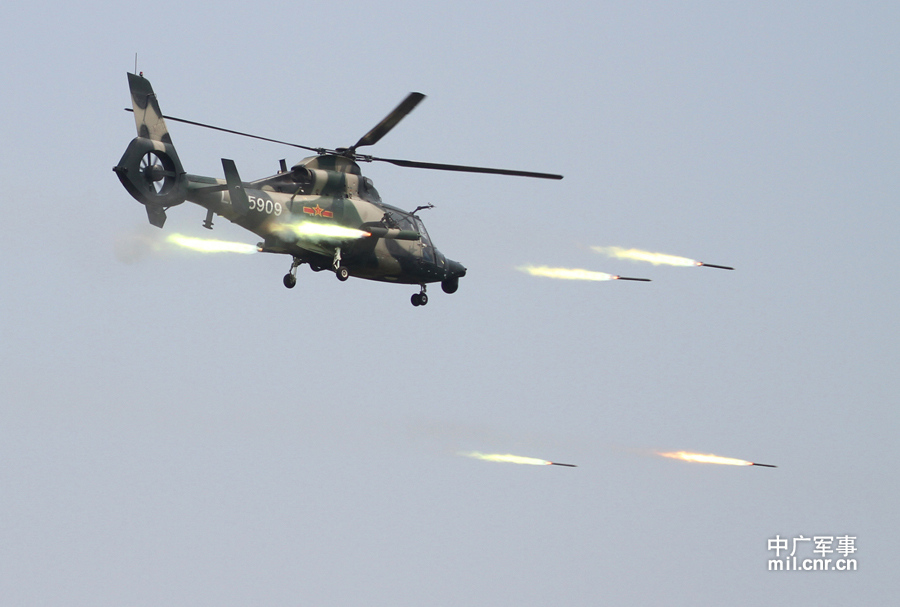 2012年6月12日,在全军陆航甲类战斗旅(团)建设标准试点验收和研讨活动期间,盛建忠组织直九武装直升机正在对“敌”目标进行火力攻击。郭维虎 摄
