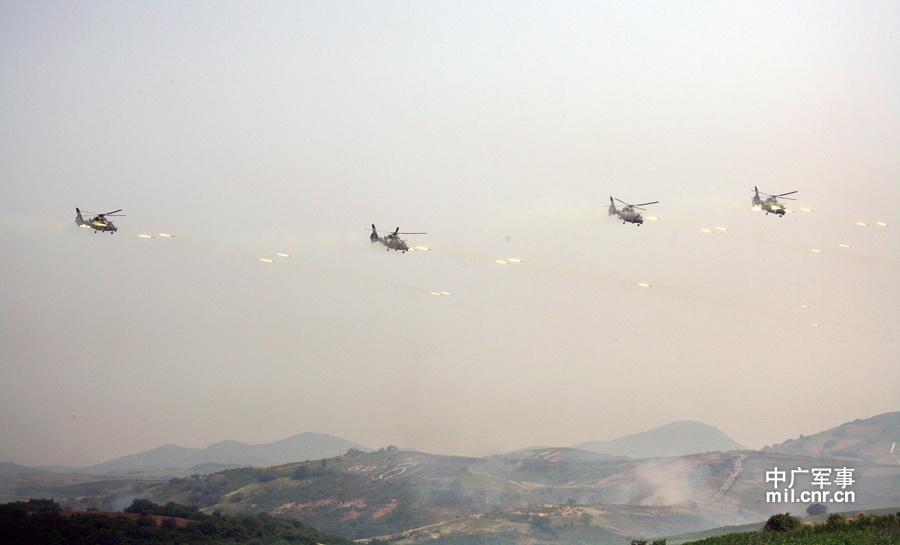 2012年6月12日,在全军陆航甲类战斗旅(团)建设标准试点验收和研讨活动期间,盛建忠组织直九武装直升机四机编队正在对“敌”目标进行火力攻击。郭维虎 摄