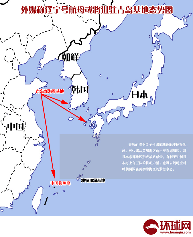 另据加拿大《汉和防务评论》2013年2月刊文猜测,中国海军航母辽宁舰的新基地位于山东省青岛市后小口子村。后小口子距离韩国西海岸不超过570公里,距离日本长崎970公里。这意味着辽宁舰的训练海域,基本在黄海和东海。