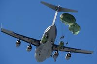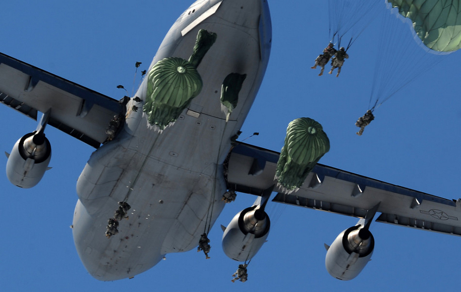 2013年4月17日,美国阿拉斯加地区,美陆军第425旅特种兵大队约60名士兵与悍马军车从C-17A战略运输机上空降演练渗透作战。这次演习,美军主要为了提升快速反应部队的实战能力。C-17A在演习起得绝对性作用。(来源:环球网)