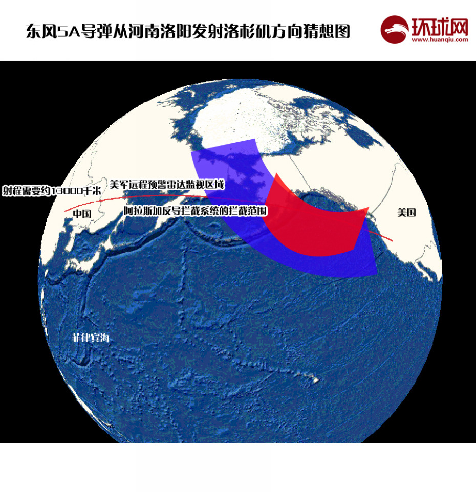 中国最初比较有效的战略核力量是东风-5导弹,这种导弹的射程达到空前的13000千米左右,值得一提的是,在70年代,中国还曾研制过环球轨道打击的30000千米射程的东风-6导弹,后下马。我们从图中可以看到即便是东风-5A导弹,要对美国西海岸洛杉矶市进行核报复已是一件非常艰难的事情,其飞行轨迹要穿越美国在日本的海基反导系统以及美国在阿拉斯加部署的地基反导拦截弹的拦截。东风-5A的突防能力相对来说,非常糟糕,如何突破美国的链接系统是个问题,毫无疑问提高导弹的突防能力,成为中国第二代核武器的主要发展方向。