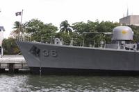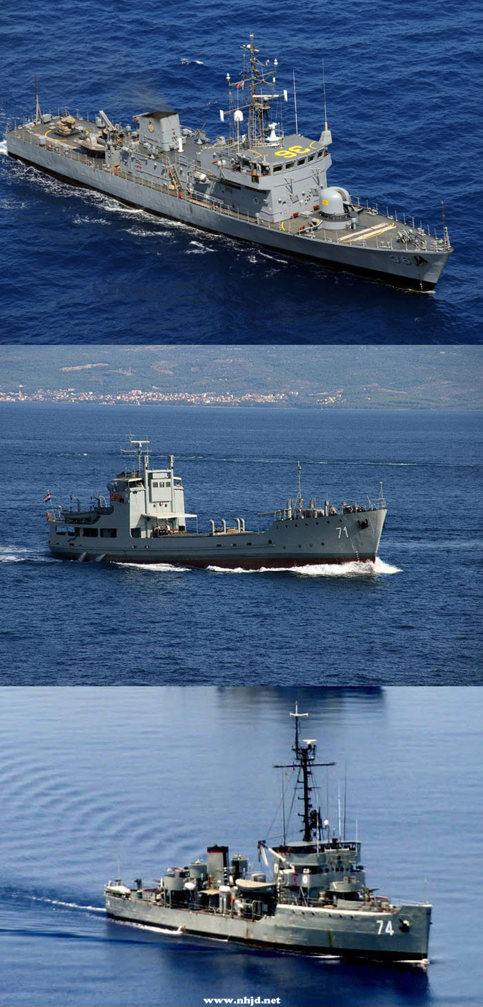菲律宾派向中国仁爱礁的三艘军舰,从上往下依次为PS36“孔雀”级巡逻舰、PS74驱逐舰和PS71运兵舰。