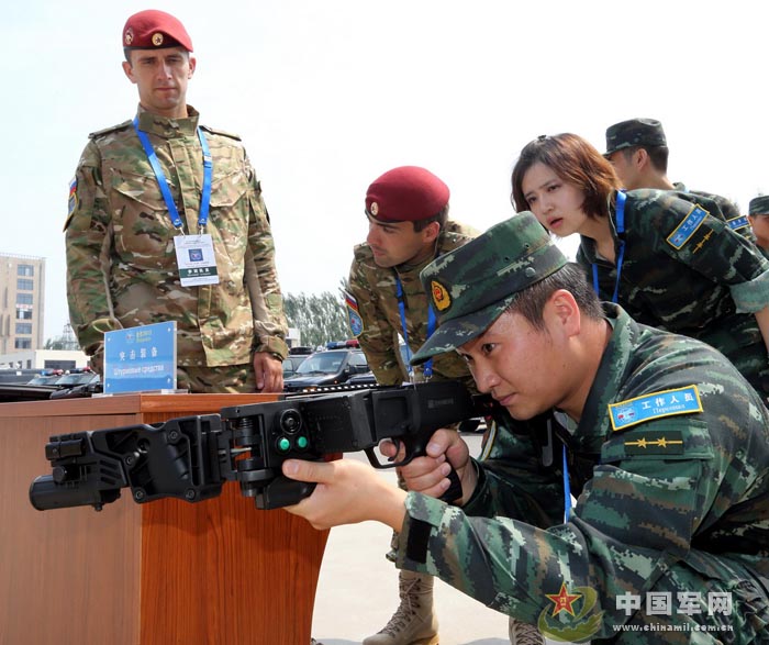 中国武警与俄罗斯内卫部队官兵熟悉武器装备。解放军报记者 乔天富 摄
