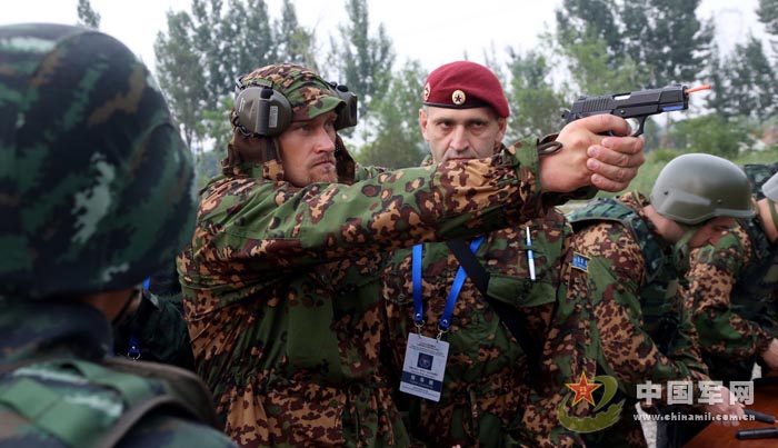 6月11日下午,中国武警与俄罗斯内卫部队“合作-2013”联合训练进行实弹体验射击。 图为中俄双方特战队员进行手枪射击经验交流。解放军报记者 乔天富 摄