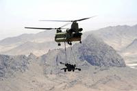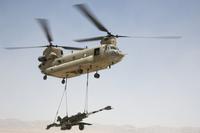 2013年6月18日,美国陆军“骑士鹰”特遣航空团CH-47“支奴干”直升机正从前沿作战基地向坎大哈机场吊运M777A2超轻型大口径榴弹炮。这个行动,同时也显示了美军强悍的机动性。(来源:新华网)