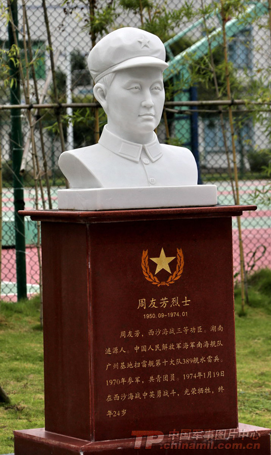 周友芳,西沙海战三等功臣。湖南涟源人。中国人民解放军海军南海舰队广州基地扫雷舰第十大队389舰水雷兵。1970年参军,共青团员。1974年1月19日在西沙海战中英勇战斗,光荣牺牲,终年24岁。