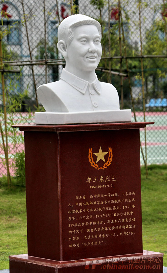郭玉东,西沙海战一等功臣。山东济南人。中国人民解放军海军南海舰队广州基地扫雷舰第十大队389舰代理给养员。1971年参军,共产党员。1974年1月19日在西沙海战中,389舰后住舱中弹进水,郭玉东在身负重伤的情况下,用自己的身体紧紧顶着堵漏塞堵住弹洞,直至生命的最后一息,终年24岁。被誉为“海上黄继光”。