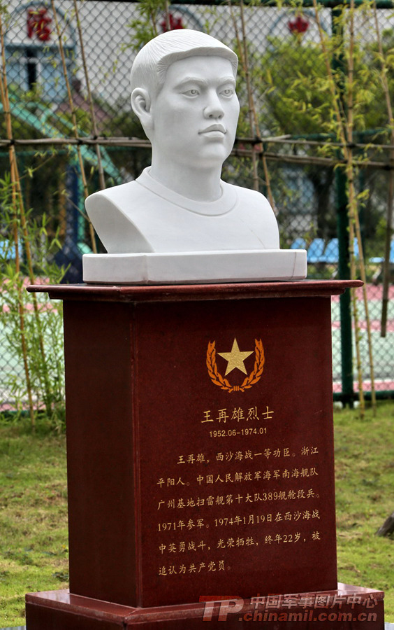 王再雄,西沙海战一等功臣。浙江平阳人。中国人民解放军海军南海舰队广州基地扫雷舰第十大队389舰舱段兵。1971年参军。1974年1月19日在西沙海战中英勇战斗,光荣牺牲,终年22岁。被追认为共产党员。
