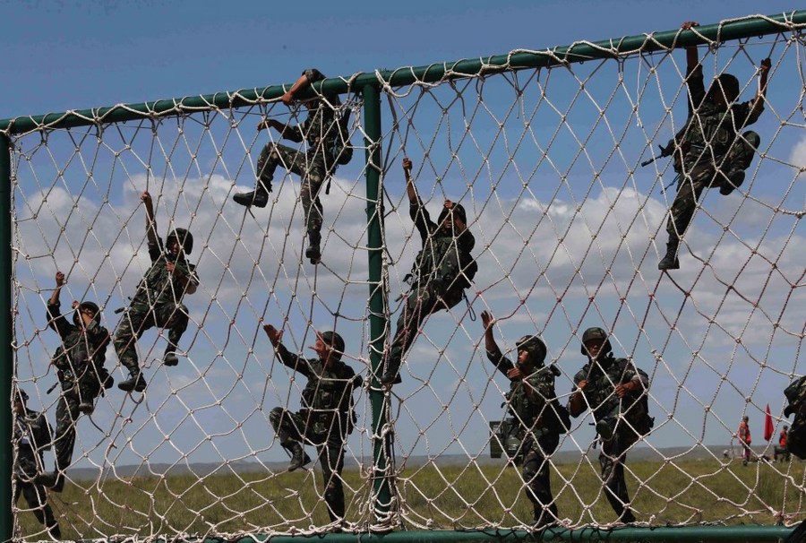 7月19日,特战队员在比武竞赛中翻越绳墙。新华社记者王建民 摄