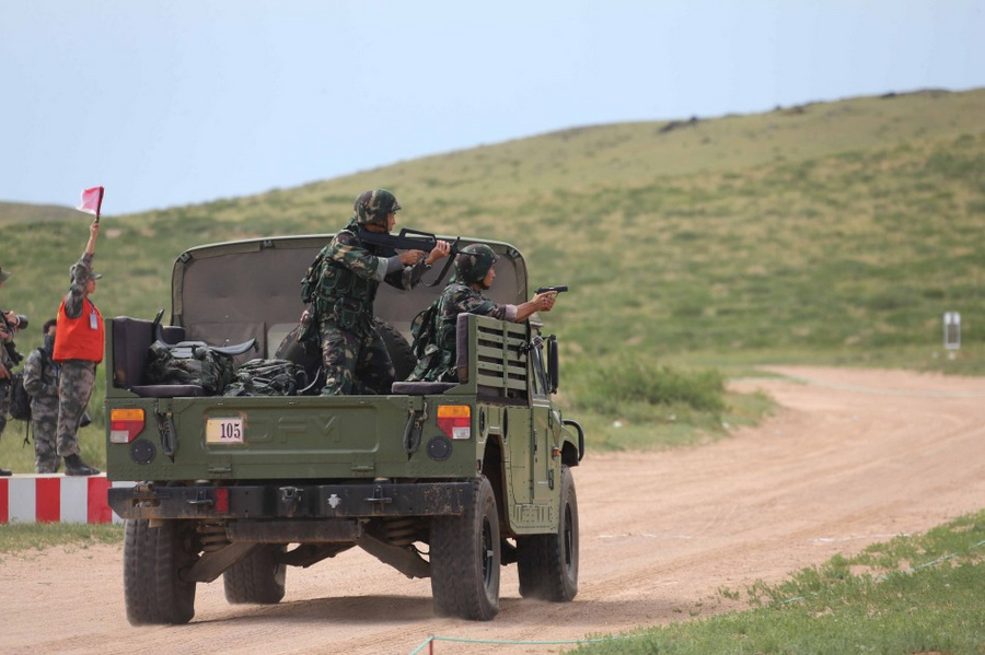 7月22日,特战队员在侦查作战比武中乘车射击。新华社记者王建民 摄