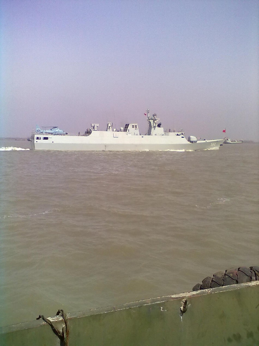 该舰在海航进行航行测试时的场景,注意其后停机坪上搭载了一架直-9直升机(可能是模型)。(来源:环球网)