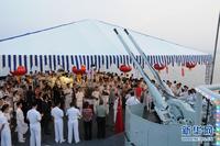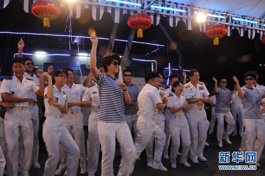 7日傍晚,即将结束对韩国访问的郑和舰举行甲板招待会。来自海军大连舰艇学院的学员及教员为韩国海军军官学校学员及当地华人华侨等献上精彩演出。(来源:新华网 赵薇)