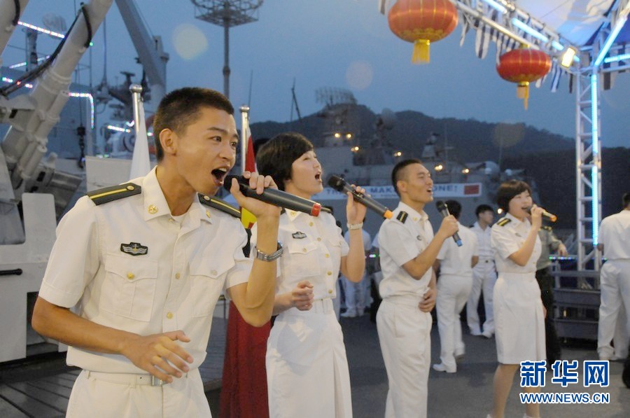 郑和舰访韩举行甲板招待会 舰员大秀骑马舞