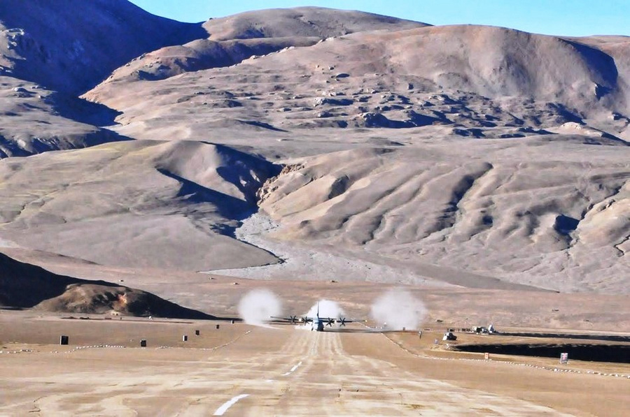 当地时间8月20日,印度空军的一架C-130J“超级大力神”运输机降落在中印边界争议地区印控克什米尔东北部拉达克地区境内的道拉伯格玉尔地空军基地(daulat beg oldie,简称DBO)。该机场处于喀喇昆仑山口脚下,海拔5312米,是世界上海拔最高的军用机场。