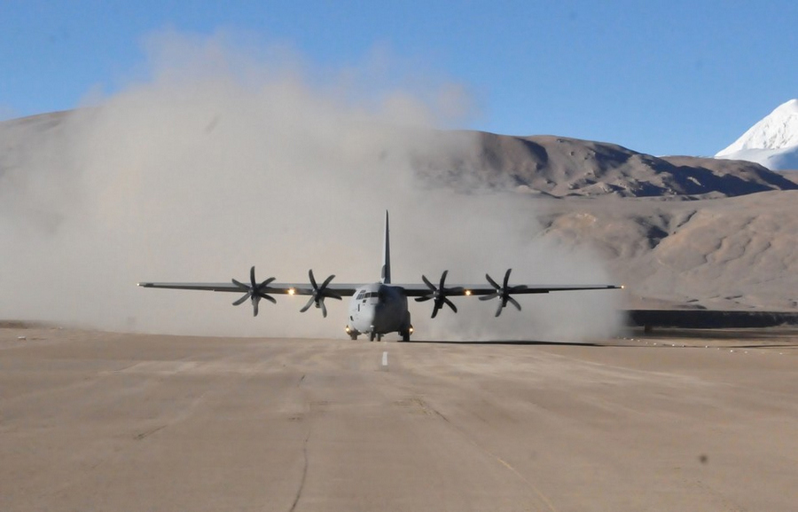 印军一架C-130J“超级大力神”运输机降落在中印争议地区前线机场。