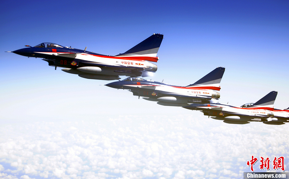 当地时间8月21日,歼-10表演机编队飞翔在俄罗斯上空。当日,中国空军7架歼-10表演机飞抵莫斯科市郊的拉缅斯科耶机场。组建51年来首次飞出国门的中国空军八一飞行表演队,应俄罗斯空军邀请前来参加第十一届莫斯科航展。中新社发 申进科 摄
