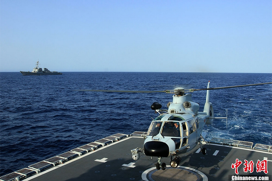 正在执行演练任务的中国海军哈尔滨舰舰载直升机。记者邓曦光 摄