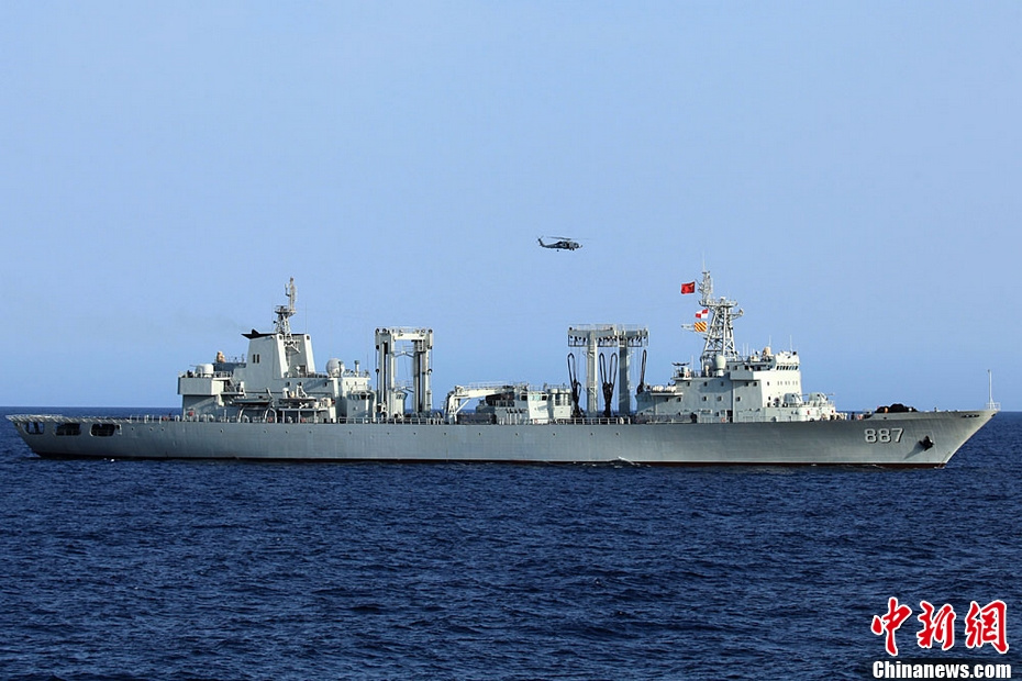 中国海军综合补给舰微山湖舰在这次演习中,承担模拟被劫商船等多项任务。记者邓曦光 摄