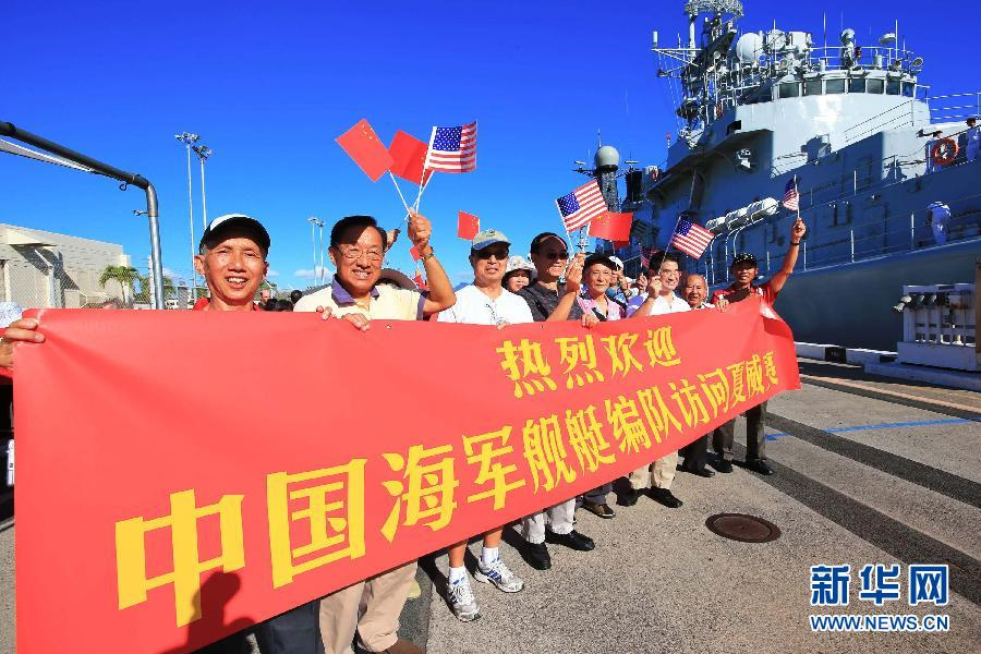 9月6日,夏威夷华人华侨代表在码头欢迎中国海军舰艇编队到来。新华社记者 查春明 摄