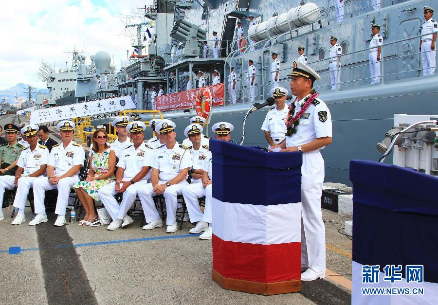 9月6日,在美国夏威夷珍珠港,中国海军舰艇编队指挥员、北海舰队参谋长魏钢海军少将(右)在欢迎仪式上致辞。 新华社记者 查春明摄