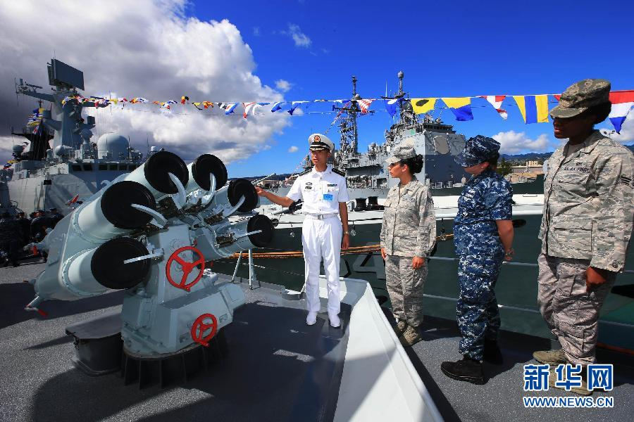 9月6日,在美国夏威夷珍珠港,美国海军官兵登上中国海军导弹驱逐舰青岛舰参观。 新华社记者 查春明摄