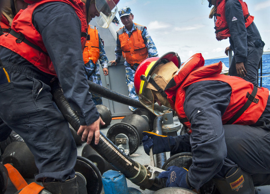 2013年9月9日,分配到美国海军CG70“伊利湖”号导弹巡洋舰上的中国海军水兵与美军水兵一起进行损管训练。