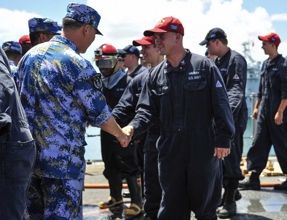 2013年9月8日,中美参加损害控制技术训练的海军人员进行交流。