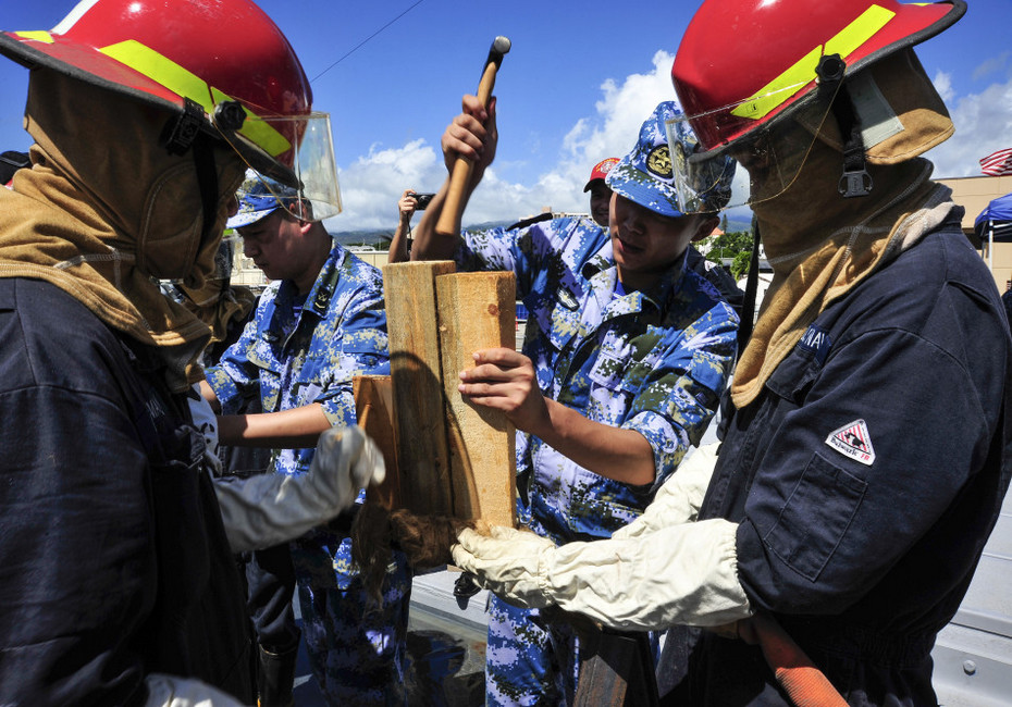 2013年9月8日,中美海军人员共同进行舰船损害控制技术训练。