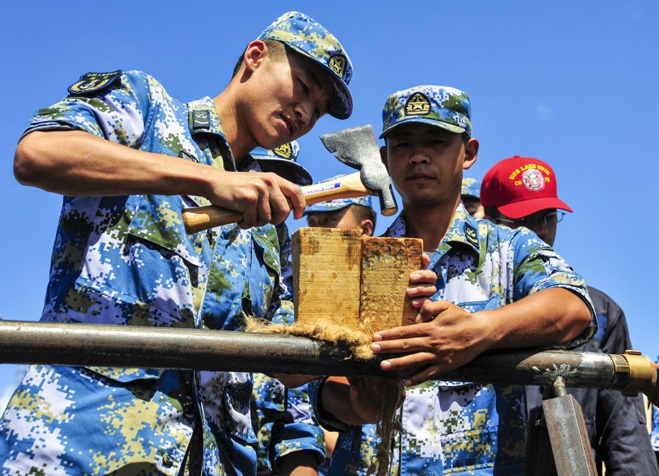 2013年9月8日,中美海军人员共同进行舰船损害控制技术训练。