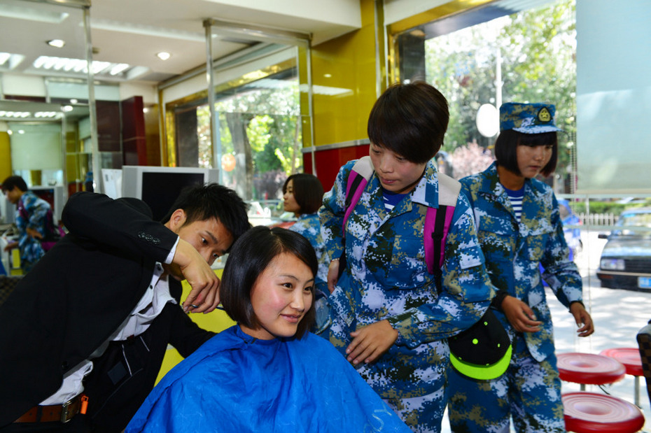 9月12日,西藏军地联合在拉萨举行2013年新兵入伍欢送仪式,为首批海军藏族大学生女兵送行。图为9月12日,在拉萨,首批海军藏族大学生女兵、云南迪庆籍的西藏大学大三学生格茸区追入伍前剪去长发。新华社发(张震 摄)