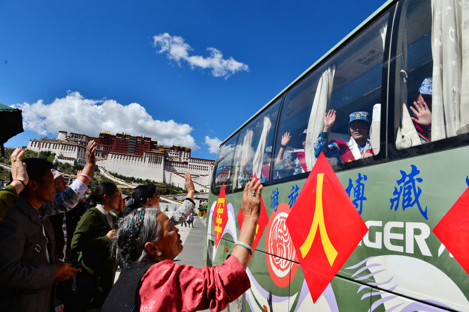 图为9月12日,在拉萨,即将出藏的首批海军藏族大学生女兵与亲友挥手告别。新华社发(张震 摄)