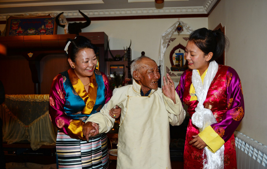 9月10日,在拉萨,巴桑卓玛(右)即将作为首批海军藏族大学生女兵奔赴海疆,爷爷扎布鼓励她好好当兵。新华社发(张震 摄)