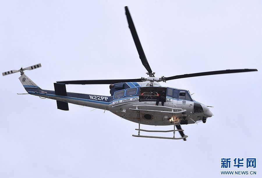9月16日,在美国首都华盛顿美国海军海洋系统司令部大院附近区域上空,直升机在空中巡逻。当日,位于首都华盛顿的海军海洋系统司令部发生枪击案,造成数人受伤。华盛顿警方负责人凯茜·拉尼尔当日说,当天发生的海军海洋系统司令部枪击案已有1名嫌疑人死亡,可能另有2名嫌疑人在逃。新华社记者张军摄