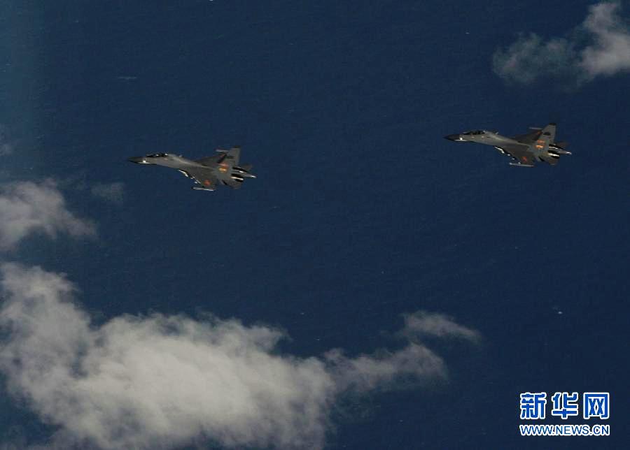 “使命行动-2013C”演习中,空军两架战机向远海千里机动。 K时,“红”方指挥部根据多维立体侦察情报,下达远程突击作战命令。几乎在同一时间,空中、海上、地面电子战作战平台,不间断地对“蓝”方实施电子干扰、压制……“红”方参演预警机、加受油机和数十架歼击机、轰炸机,从相距数百公里的多个军、民用机场迭次起飞,千里奔袭“蓝”方目标阵地。新华社发(沈玲 摄)