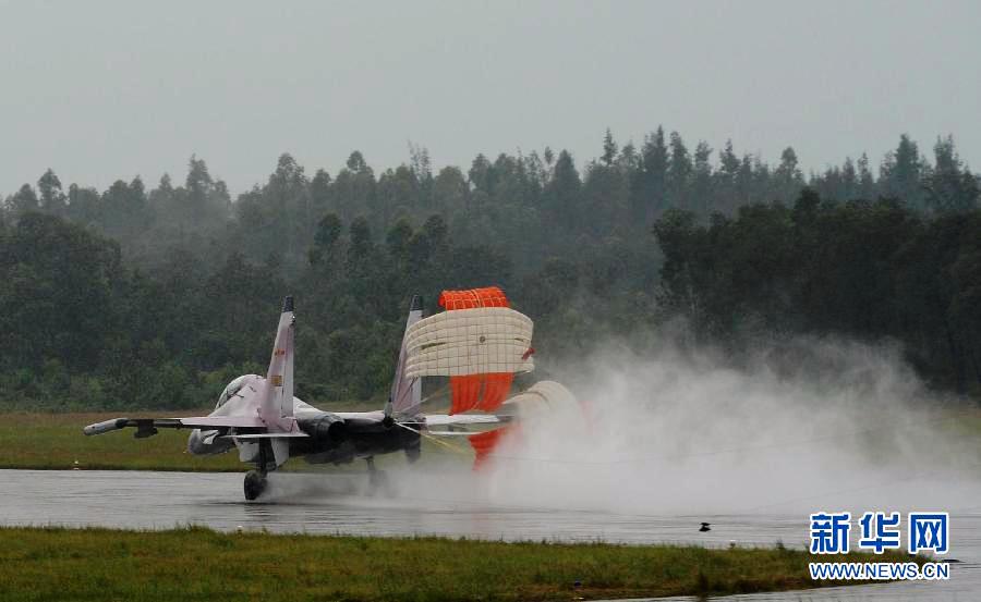 “使命行动-2013C”演习中,空军战机冒雨飞行归来。 K时,“红”方指挥部根据多维立体侦察情报,下达远程突击作战命令。几乎在同一时间,空中、海上、地面电子战作战平台,不间断地对“蓝”方实施电子干扰、压制……“红”方参演预警机、加受油机和数十架歼击机、轰炸机,从相距数百公里的多个军、民用机场迭次起飞,千里奔袭“蓝”方目标阵地。新华社发(沈玲 摄)