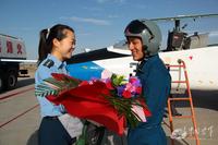 解放军飞行学员成功单飞 女中尉送花祝贺