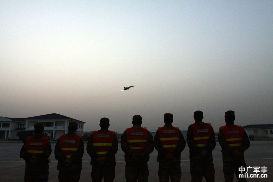 机务官兵在夕阳下看着自己维护的战鹰翱翔 郝茂金 摄