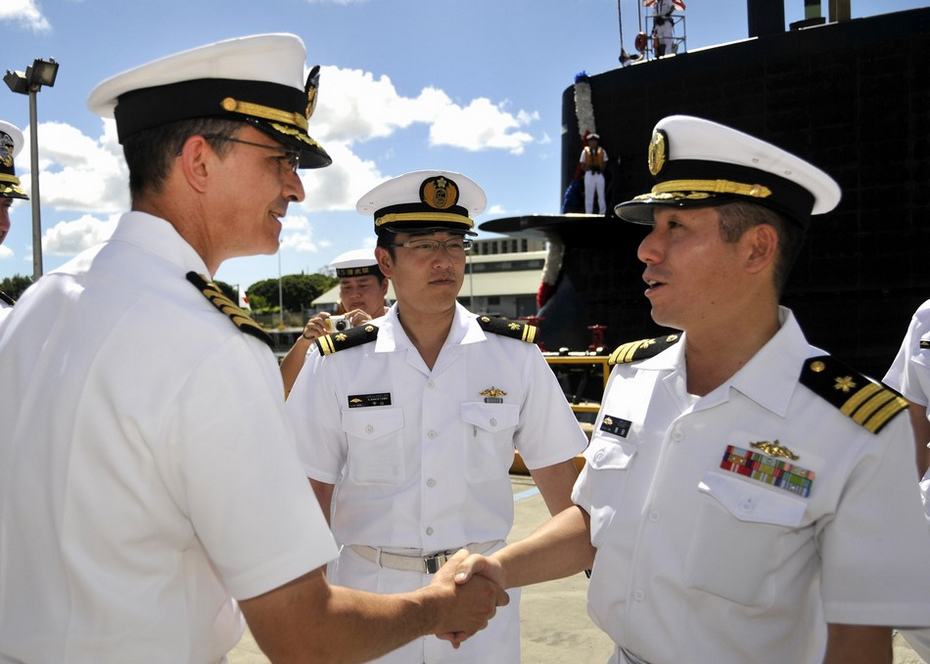 日本海自“云龙号”潜艇访问珍珠港,美日军官握手