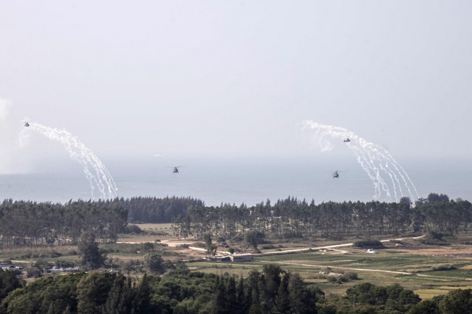 10月20日,在“使命行动—2013B”跨区机动战役演习中,陆航对岸滩阵地发起攻击。电磁空间,电子对抗、网络攻防激烈展开;水际滩头,信息火力一体打击,两栖精兵突击上陆;敌后丛林,特战尖兵从天而降…… 20日上午,东南沿海某地,“使命行动—2013B”跨区机动战役演习实兵实弹演练全面打响。 新华社发(吴泳希 摄)