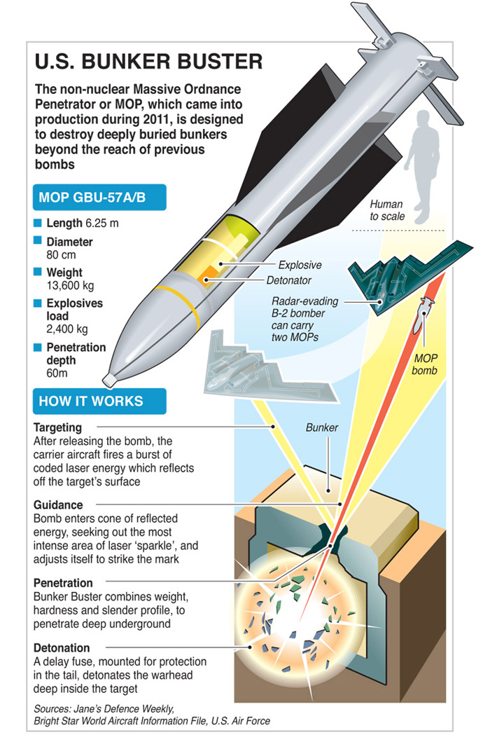 作为侵彻能力最强的钻地弹,MOP巨型钻地弹长度6.2米、直径0.8米,质量高达30000磅(13.6吨),高爆炸药质量5300磅(2.4吨),将由B-2A隐形轰炸机在12000米高度投放。大长径比外形可以实现更高的下落速度,炸弹制导控制律保证了落地时接近垂直地面,加上本身巨大的质量,MOP巨型钻地弹具有极大的动能,撞击地面时的冲击力非同小可。为了防止弹体撞击变形,它使用了高强度合金钢,也有报道认为侵彻弹头壳体甚至使用了贫铀加强强度。MOP巨型钻地弹可以看作一枚巨型的动能弹芯,设计上具有穿透61米厚度混凝土(34MPa)或8米厚度加固混凝土(69MPa)或是40米厚度坚固岩层的能力,这是除了核武器外人类对加固掩体侵彻能力最强的武器。
