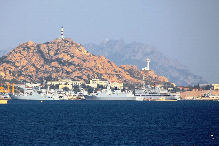 网友于近日在青岛辽宁舰母港拍摄到的辽宁舰航母及其编队的其他舰船