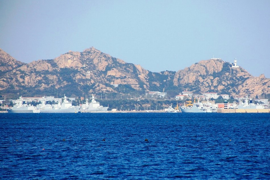 网友于近日在青岛辽宁舰母港拍摄到的辽宁舰航母及其编队的其他舰船