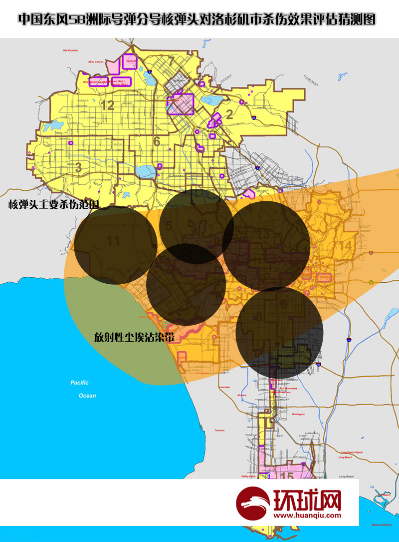 图片为洲际导弹对洛杉矶市的总体杀伤效果评估,黑色圆圈为五个核弹头的直接杀伤区域。众所周至,核武器是大国国家安全的基石。中国奉行不首先使用核武器政策,而“后发制人”的核力量必须满足两个基本条件:可靠的生存性能和足够有效的打击能力。近年来,美国越来越“重视”中国的核力量。俄亥俄级战略核潜艇移防至西太平洋,其动机就包括增强对我陆基核力量的打击能力。美国有人声称,俄亥俄级搭载的核弹头可在第一波核打击中消灭我绝大部分甚至全部陆基核力量。这里姑且不论美国是否掌握了我洲际导弹地井的精确位置以及能否在战时有效侦测到机动洲际导弹发射车的位置,美国的这种战略野心就迫使得我们必须尽快提高核力量的生存性能,尤其是改变陆基单一部署的局面,实现核力量的海陆“两位一体”。正如《2008年中国的国防》白皮书所说,海军要“增强核反击能力”。(制图:裴申)