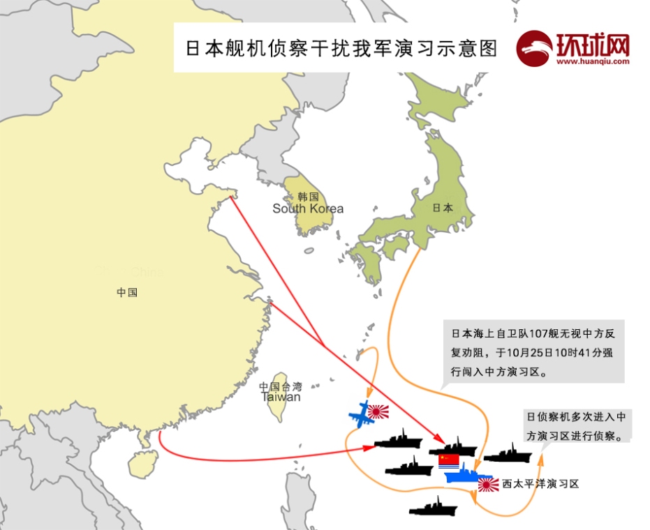杨宇军:10月23日,中方通过国际海事组织公布,中国海军定于10月24日至11月1日在位于西太平洋公海海域的有关海区举行军事训练和实弹射击,提醒各国过往舰机注意避让。但是,日本海上自卫队107舰无视中方反复劝阻,于10月25日10时41分强行闯入中方演习区,并长时间滞留,直至28日7时32分才离开。同时,日侦察机多次进入中方演习区进行侦察。此外,在中方参演兵力正常航渡期间,日自卫队舰机还持续实施高强度的跟踪、侦察和监视。