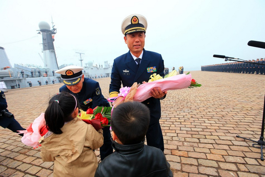 11月3日,青岛市小朋友向编队指挥员献花。新华社记者 查春明 摄