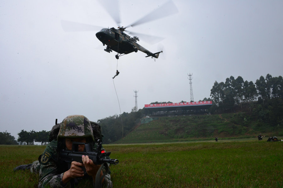 中印参训分队混编后,进行了简易爆炸物的搜索与排除、建立隐蔽观察哨、直升机索降等训练。新华社发(王德思 摄)