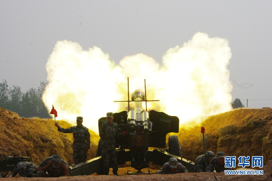 “确山·前锋—2013B”演习在济南军区确山训练基地举行,来自89个国家约350名外军人员观摩了这次演习。图为红方炮兵群对敌目标进行火力覆盖。王永豪 摄