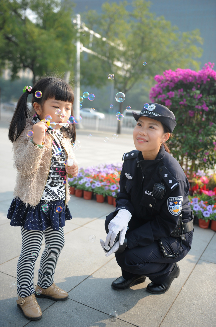 10月17日,杨千叶在西单附近照看一位小朋友。每当看到小朋友单独玩耍时,杨千叶都会上前询问其父母在哪儿,以防止孩子走失。新华社发(孟涛 摄)