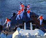 10时30分,联合登临检查演练开始。中乌双方舰艇互相模拟载有非法货物的商船接受登临检查,首先由萨盖达奇内号导弹护卫舰模拟商船,在衡水舰提出登临检查要求后停车漂泊,衡水舰随即派出联合临检小组乘小艇对其进行登临检查。检查结束后,衡水舰模拟商船,萨盖达奇内号演练了登临检查。